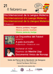 Somos conscientes del inmenso tesoro que supone para Aragón el contar con tres lenguas. Es algo que hay que conocer, valorar y pregonar. De eso irá el acto que organizaremos el viernes 21 de febrero, a las 19 h, en el Salón de Plenos de la Diputación de Zaragoza, con la proyección de documentales en nuestras lenguas minoritarias, la lectura de poemas de Merche Llop, música a cargo de miembros de La Orquestina del Fabirol…