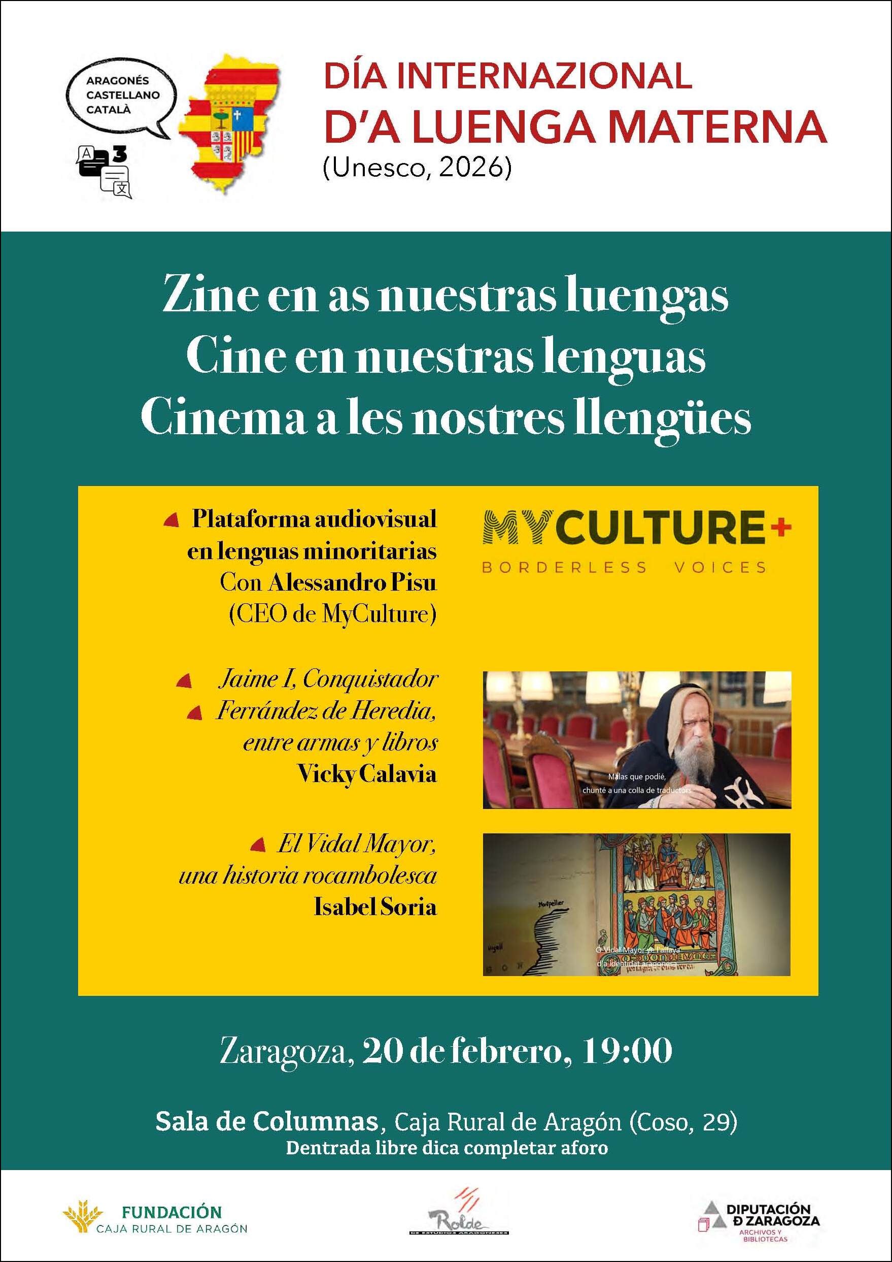 La apuesta por la diversidad lingüística como riqueza y por las lenguas como herramientas de comunicación, tomará forma el viernes 20 de febrero (19 h) con Zine en nuestras luengas / Cine en nuestras lenguas / Cinema a les nostres llengües. En la sede zaragozana de la Fundación Caja Rural de Aragón (Centro Mercantil) se asistirá a la presentación de MyCulture+, una empresa de distribución cinematográfica con una plataforma dedicada a la difusión de trabajos audiovisuales en lenguas minoritarias. Su responsable, Alessandro Pisu explicará los pormenores de este proyecto.