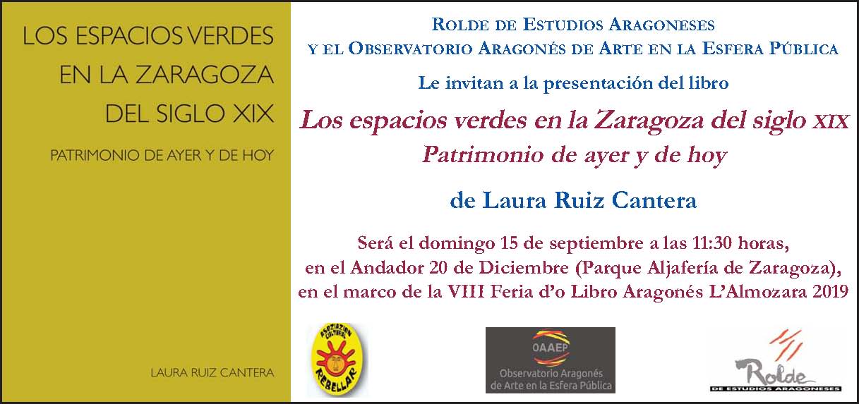 Entre las actividades previstas, se encuentra la presentación del libro Los espacios verdes en la Zaragoza del siglo XIX. Patrimonio de ayer y de hoy, de Laura Ruiz Cantera, editado en la pasada primavera por REA, en colaboración con el Observatorio Aragonés de Arte en la Esfera Pública. Será a las 11:30 de la mañana.