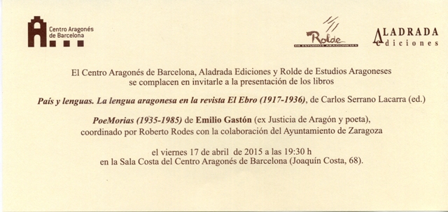 Además tendrá lugar la presentación de País y lenguas. La lengua aragonesa en la revista El Ebro (Carlos Serrano, Aladrada): un trabajo muy vinculado al ambiente de la emigración aragonesa en Cataluña, y basado en investigaciones en las que participó nuestra asociación.