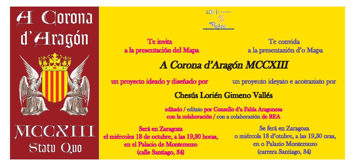 El mapa «A Corona d’Aragón MCCXIII», diseñado por Chesús Lorién Gimeno, ha sido editado por Consello d’a Fabla Aragonesa con la colaboración de Rolde de Estudios Aragoneses y el autor
