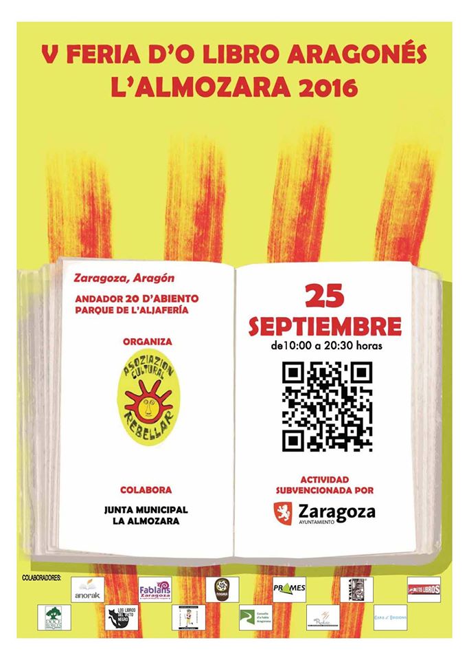 La asociación cultural Rebellar organiza por quinto año consecutivo la «Feria del Libro Aragonés» en el barrio zaragozano de La Almozara. Este año cambian las fechas de la primavera al principio del otoño, y la ubicación. Va a ser un evento al aire libre, en el andador del parque de la Aljafería, el domingo 25 de septiembre, con presentaciones de libros, animación… Nuestra asociación estará ahí. ¡Te esperamos!