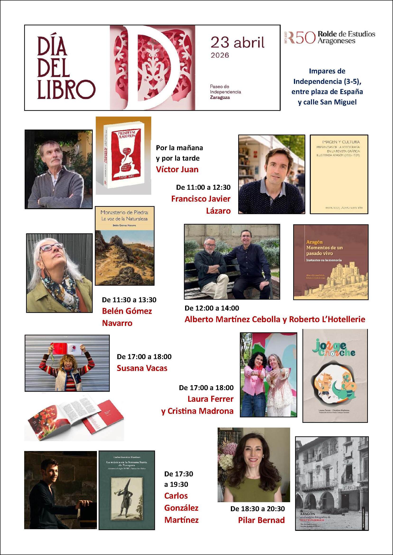 Todos estos autores y autoras nos acompañarán en las mesas de firmas, junto a otros autores de obras ya publicadas en 2025, como Francisco Lázaro (Imagen y cultura. Presencias de la fotografía en la revista gráfica ilustrada Aragón) y Susana Vacas (Mujeres Vaca y otras obras), así como por Laura Ferrer y Cristina Madrona (autoras del libro infantil ilustrado bilingüe aragonés-castellano Chorche/Jorge editado por Aladrada).