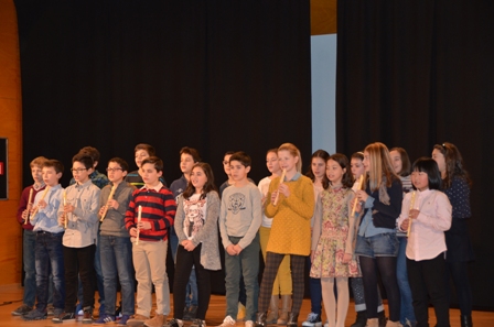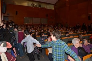 También se proyectaron trabajos audiovisuales elaborados en aulas donde se estudia aragonés, a cargo de la Clica Cinca-Cinqueta, EchoMusical y el taller de radio de Escuelas Pías. Alumnos y alumnas de este último centro nos deleitaron con «Aqueras montañas» y bailaron al son de la música de Bucardo (Bente d’Abiento), animados por miembros de Bureo Aragonés.